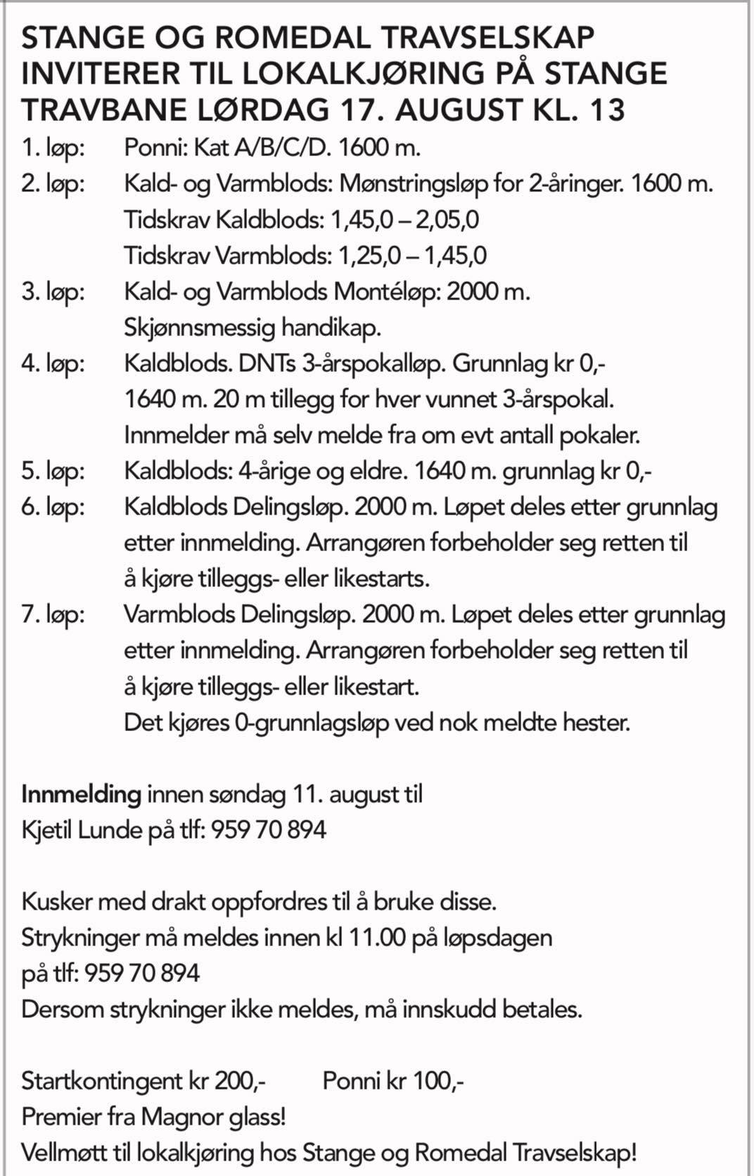 Innmelding innen 11.august til Kjetil Lunde tlf: 95970894